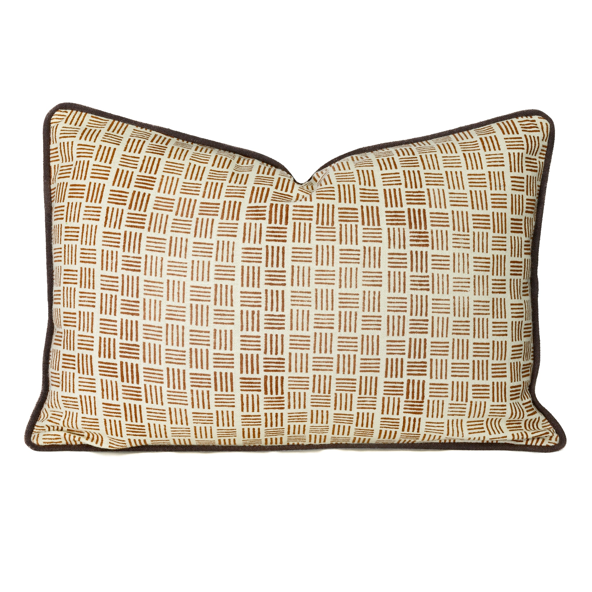 The soft, rustic mocha-colored cotton basket weave block print lumbar cushion cover complements the dark chocolate piping beautifully. Paired with our Espresso Accent Cushion Cover, this piece has the ability to ground a space and harmonize with wooden textures in and around the home.