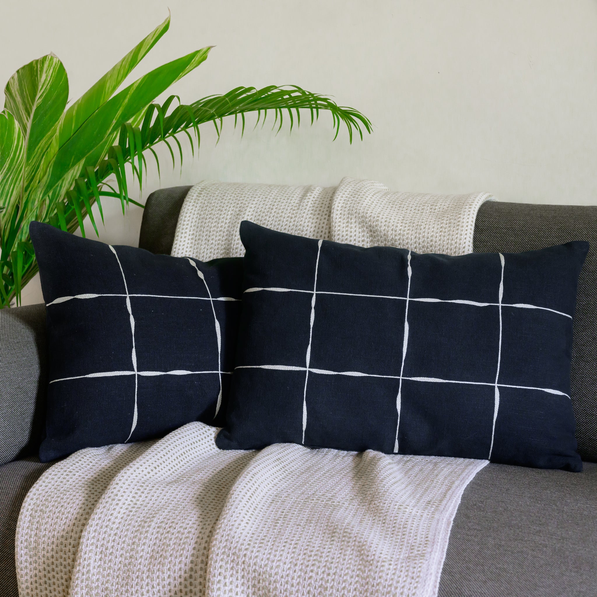 The Charcoal Grid Lumbar cushion cover combines our soft signature base fabric with delicate ivory hand embroidery—slightly wavy, subtly undulated, yet perfectly geometric and minimalistic. A true standout, it adds effortless charm to your bed, sofa, or armchair.