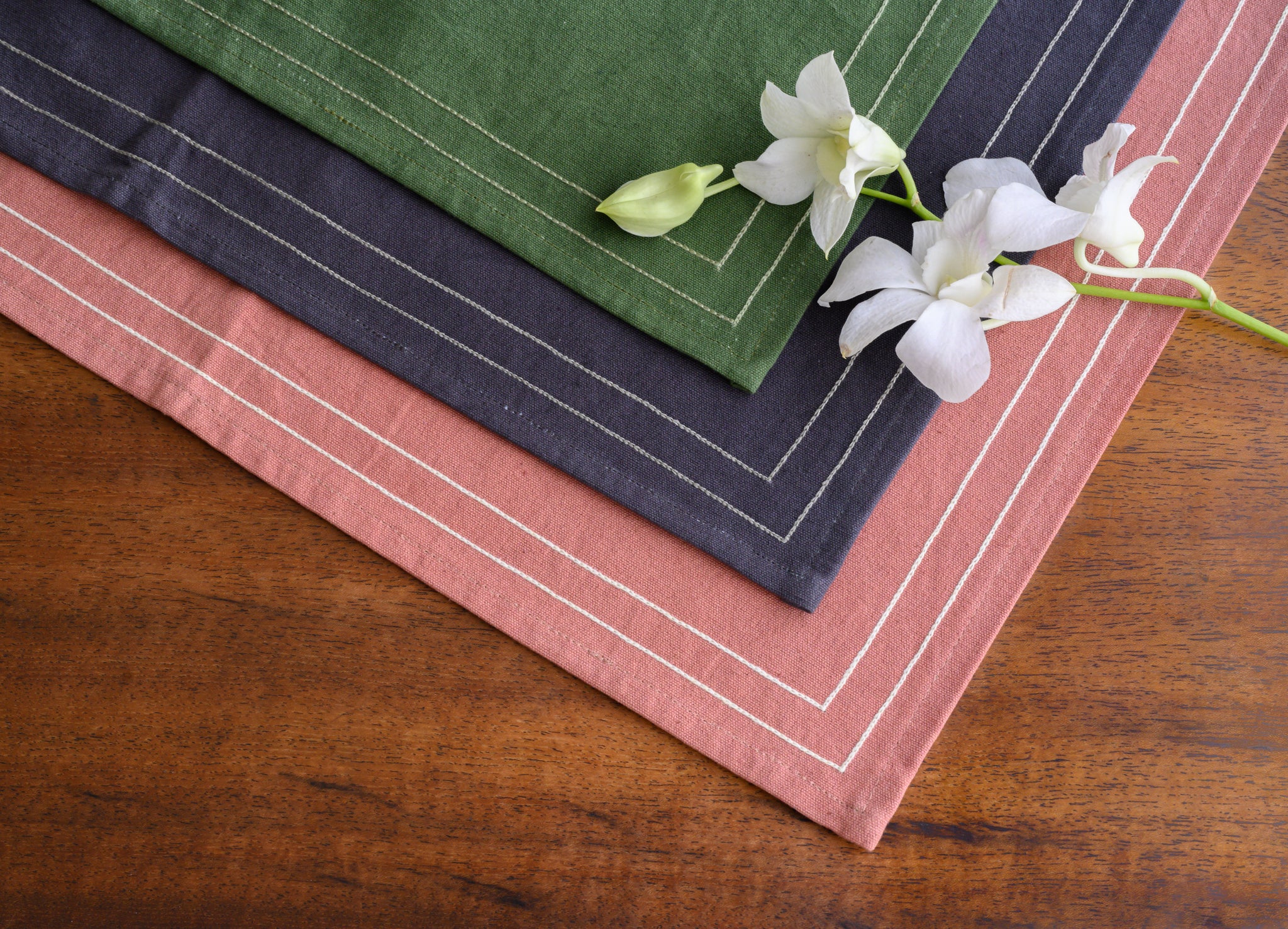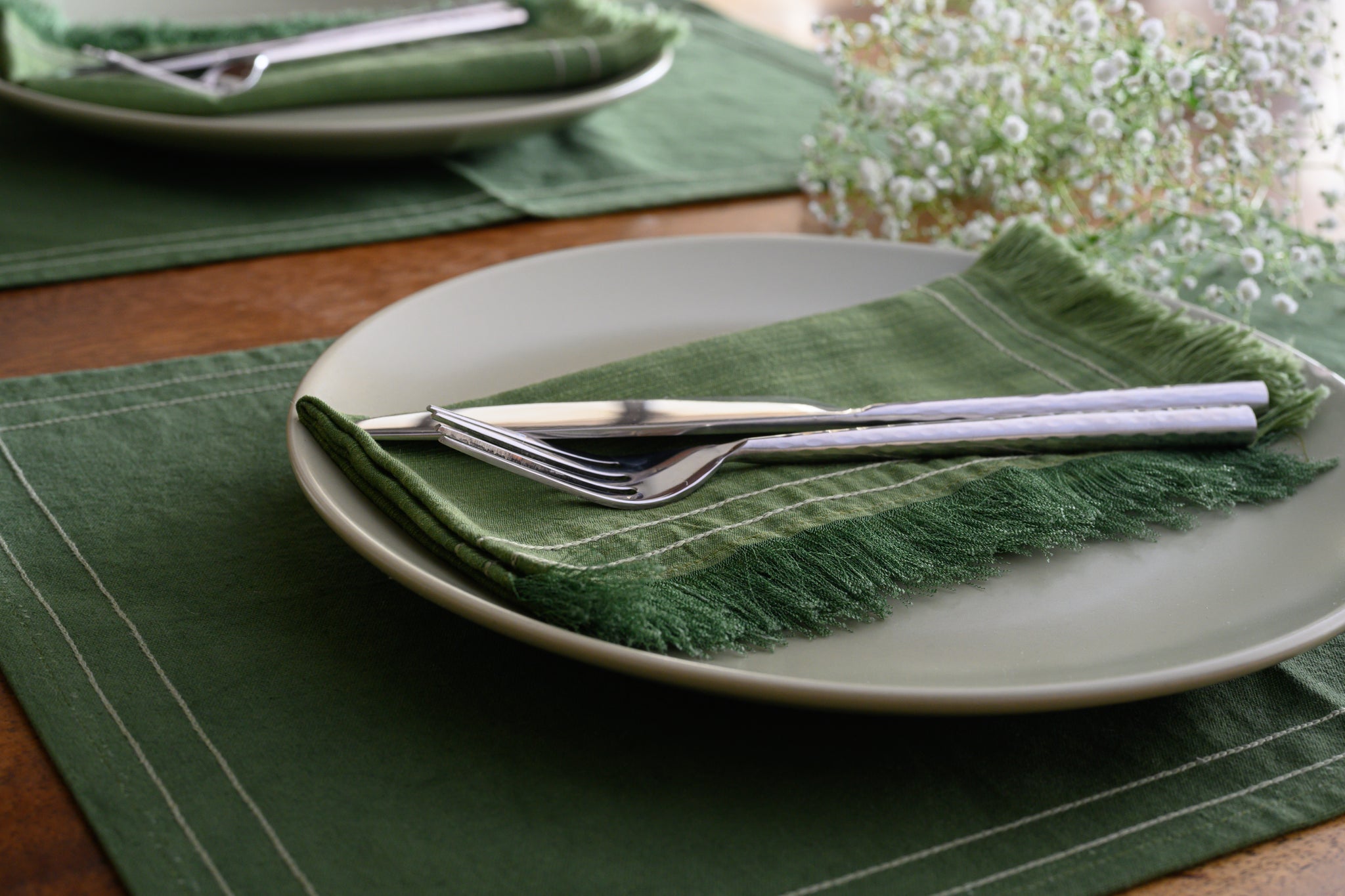 Dress up your dining table with our soft cotton, light and durable Olive Green Handcrafted Placemats for daily use. With subtle mint green embroidery on all edges, this ripe olive placemat set adds a quiet moodiness to any table top. Pair this with our Olive Green fringed dinner napkins for the perfect table setting.
