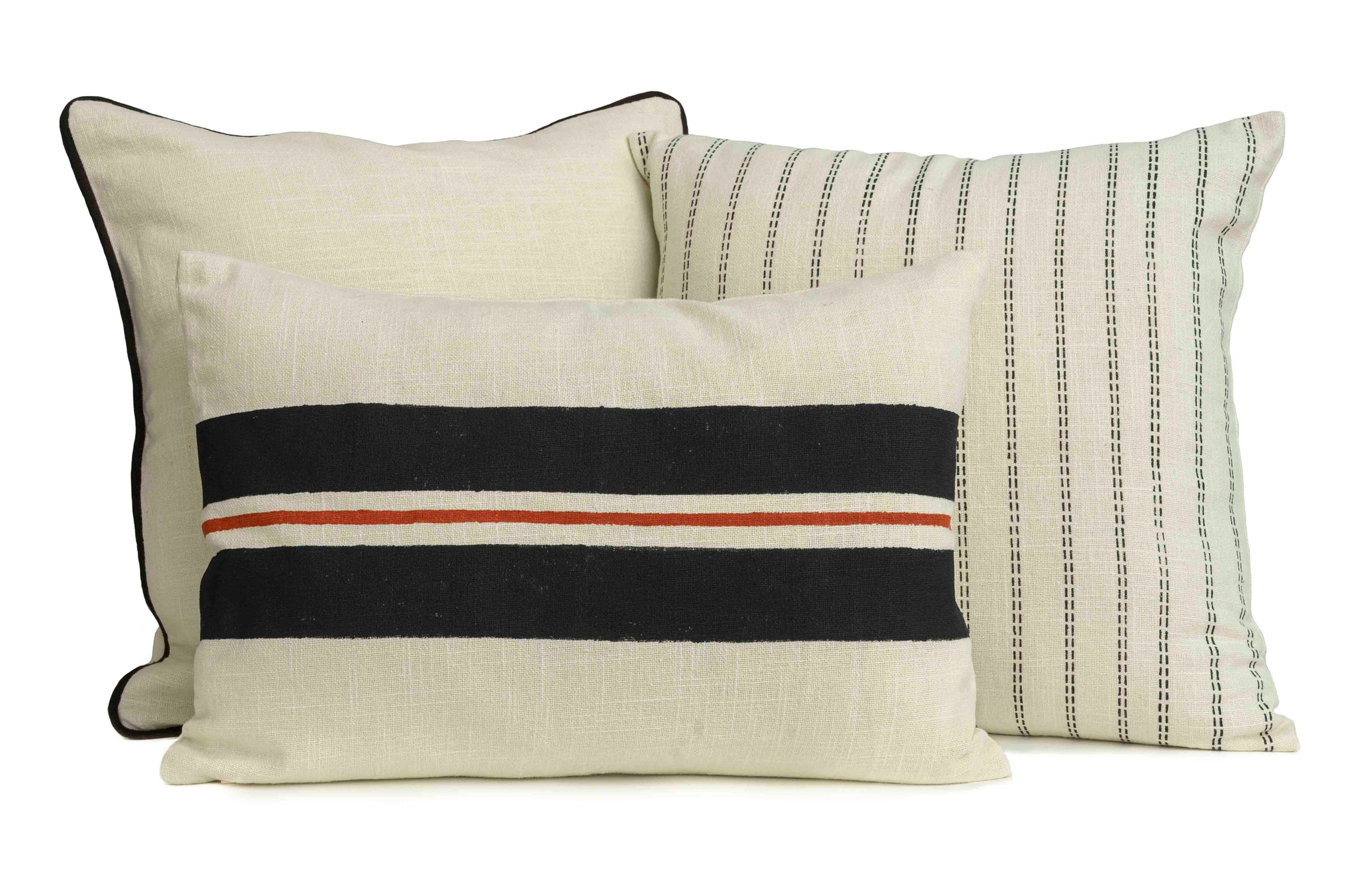 The heavy and light block prints create a striking contrast, while the ivory cushion offers a visual break. The Charcoal and Ivory Bundle Trio - the Scarlet, Hampton and Accent cushions - combines harmony and minimalism beautifully.