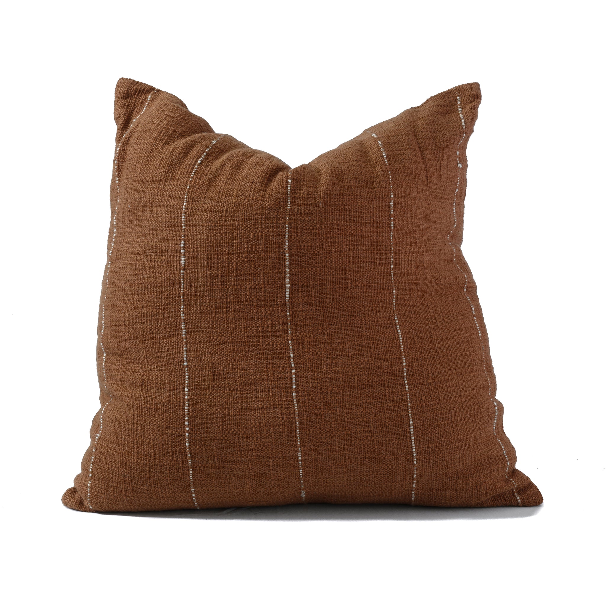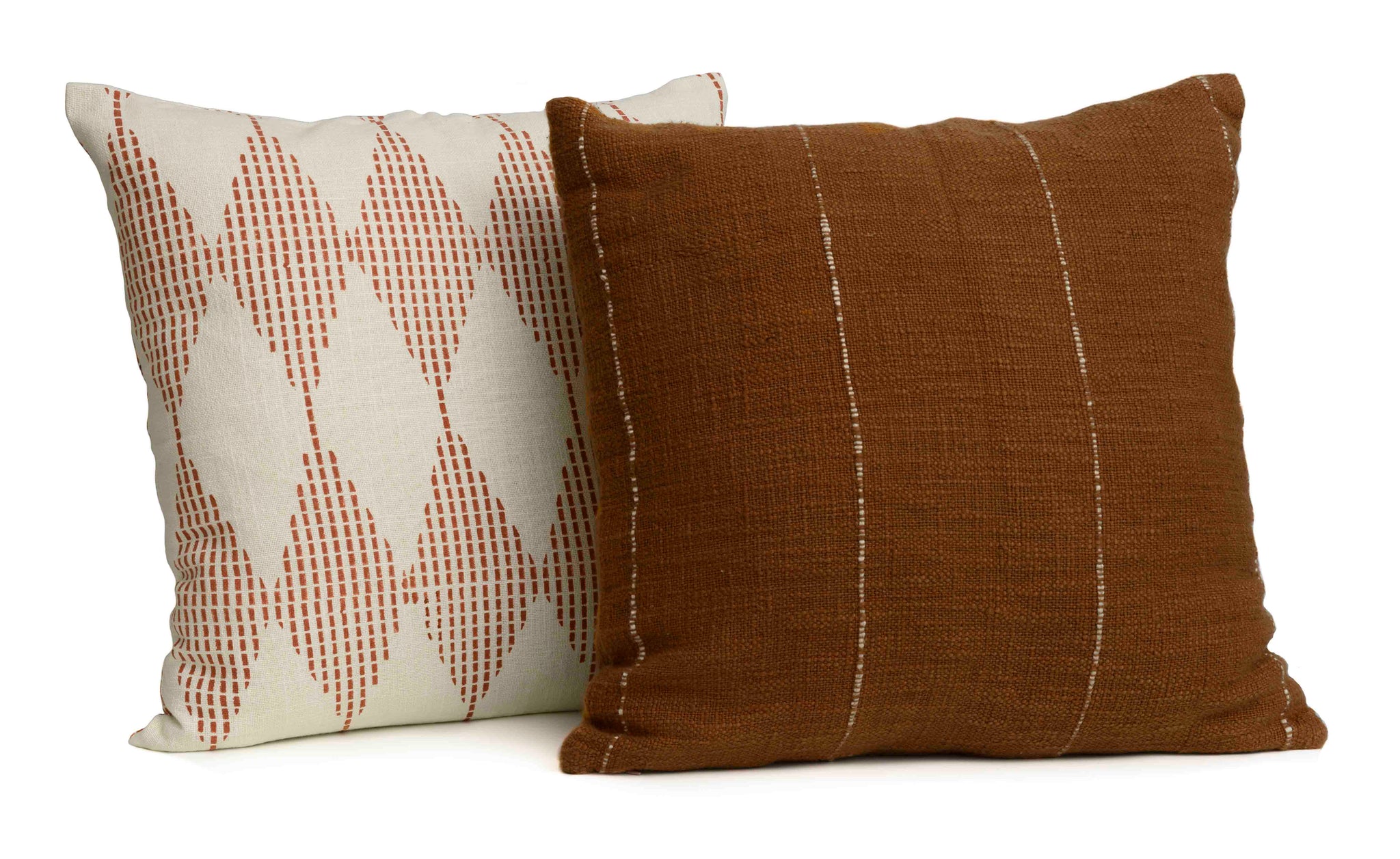 Pairing a woven cushion with a block printed cushion always yields great results. With our Terracotta Ensemble, the light terracotta block print on the Dia cushion enhances the rich, single-toned Harbour cushion.