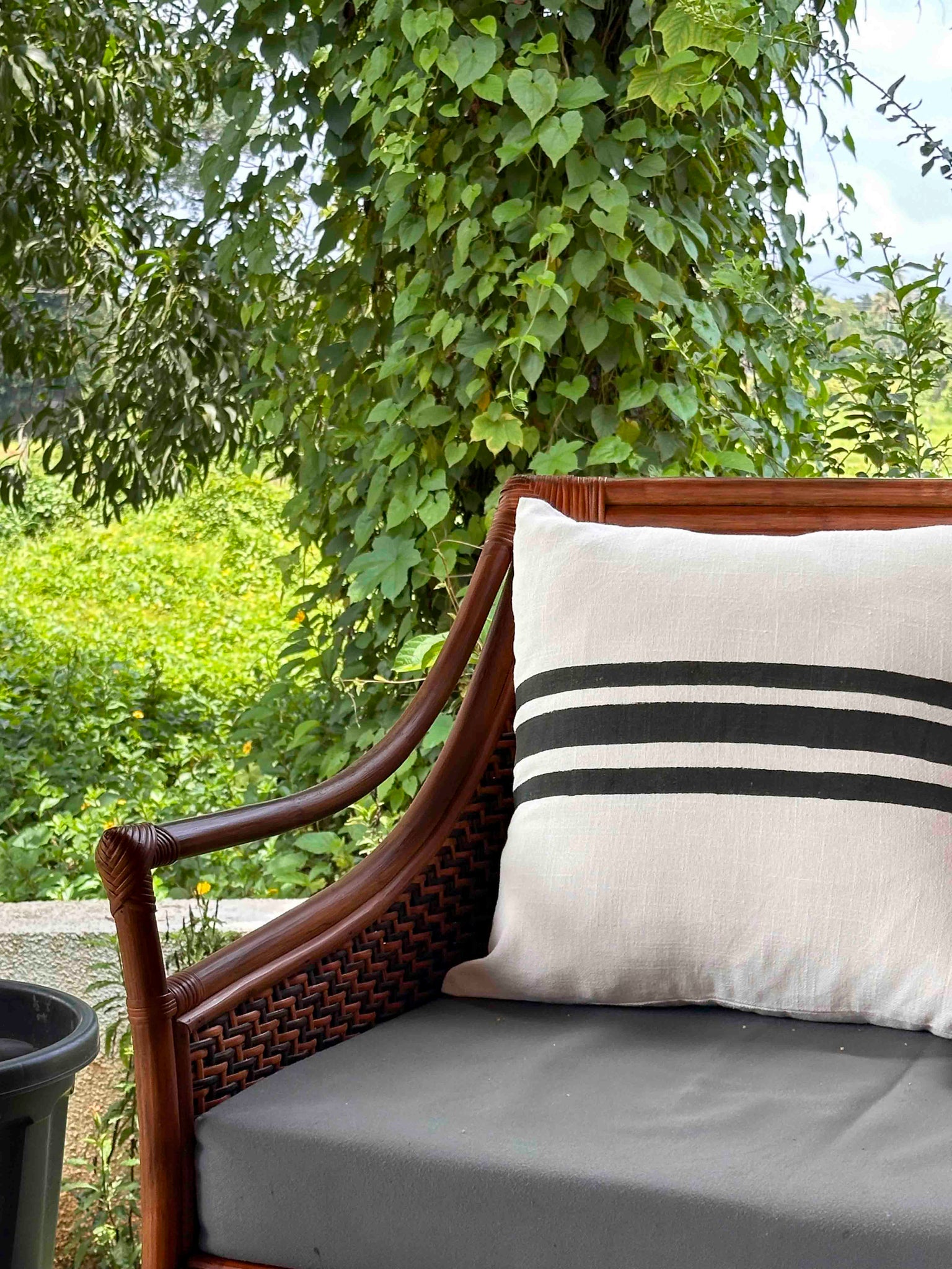 Transform your home with our chic olive green Willow Lumbar Cushion Cover, showcasing bold, thick stripes hand block printed on a gentle ivory cotton fabric. This piece is plush and exudes warmth making it an ideal addition to any modern interior.